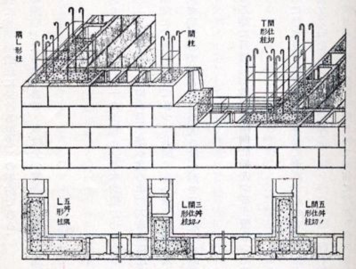 この建物の構造に特徴があります。中村鎮式鉄筋コンクリートブロックと言われるものが使われています。左の図にあるようなやや大きめのコンクリート・ブロックを積み上げ、中に鉄筋を配します。昭和の初期としては画期的だったと思います。