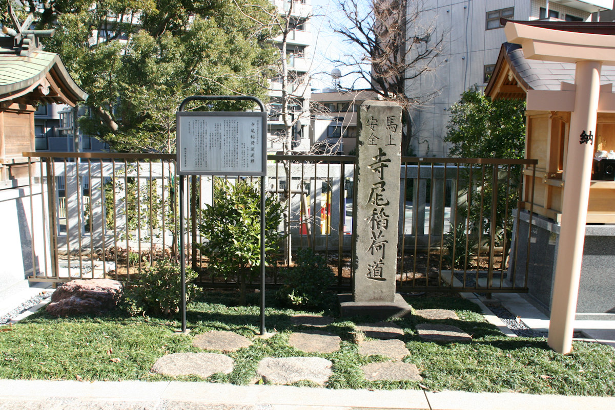 寺尾稲荷道道標は、旧東海道の鶴見橋(現鶴見川橋)付近から寺尾・小杉方面への分岐点にあった三家稲荷に建てられていたもので、一村一社の神社合祀令によって、大正年間に三家稲荷が鶴見神社境内に移された時に、移されたと思われます。昭和三〇年代前半頃に、鶴見神社境内に移されていた三家稲荷の鳥居前の土留め作業を行なった際、道標が埋没しているのが発見されました。