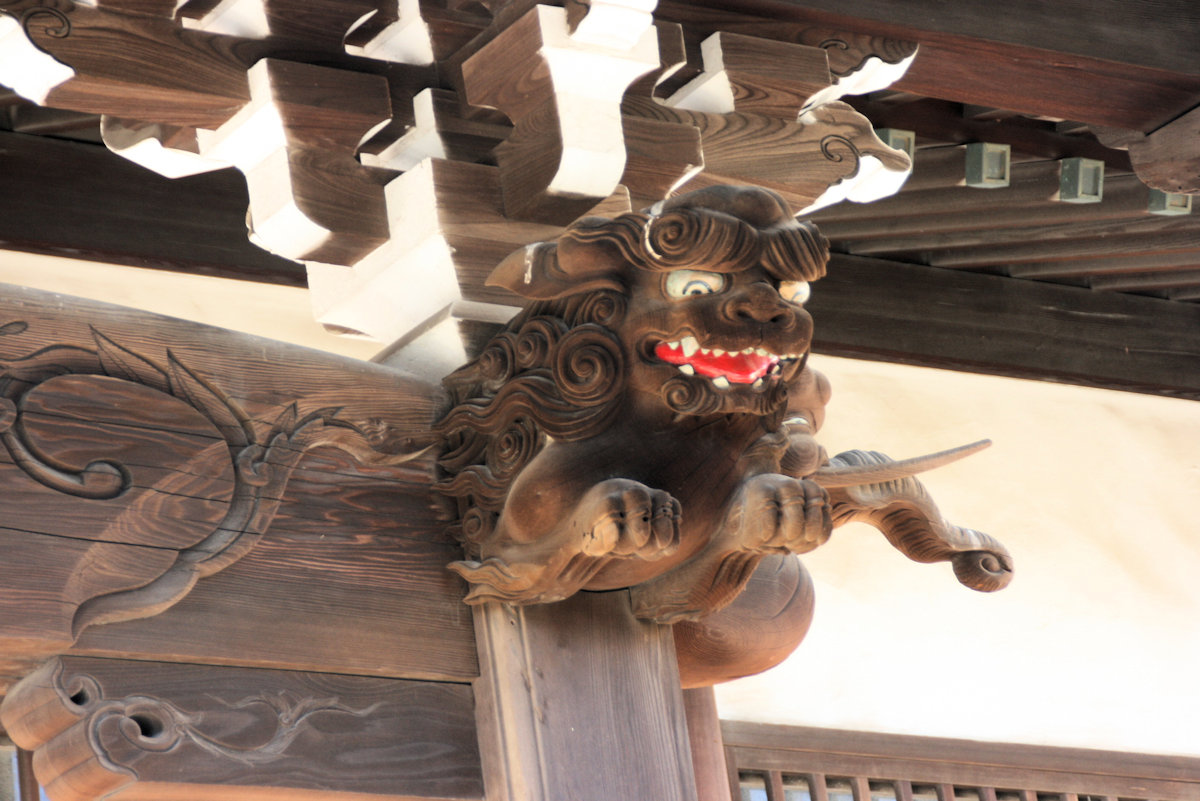 お堂を護るという元々の目的と言うことからは、外に居るのが正しいんですけどね。このお寺さんから見えるのは、馬場町にある水道塔ですが、丁度、三つ池にある電波塔が重なって「角」があるように見えます。