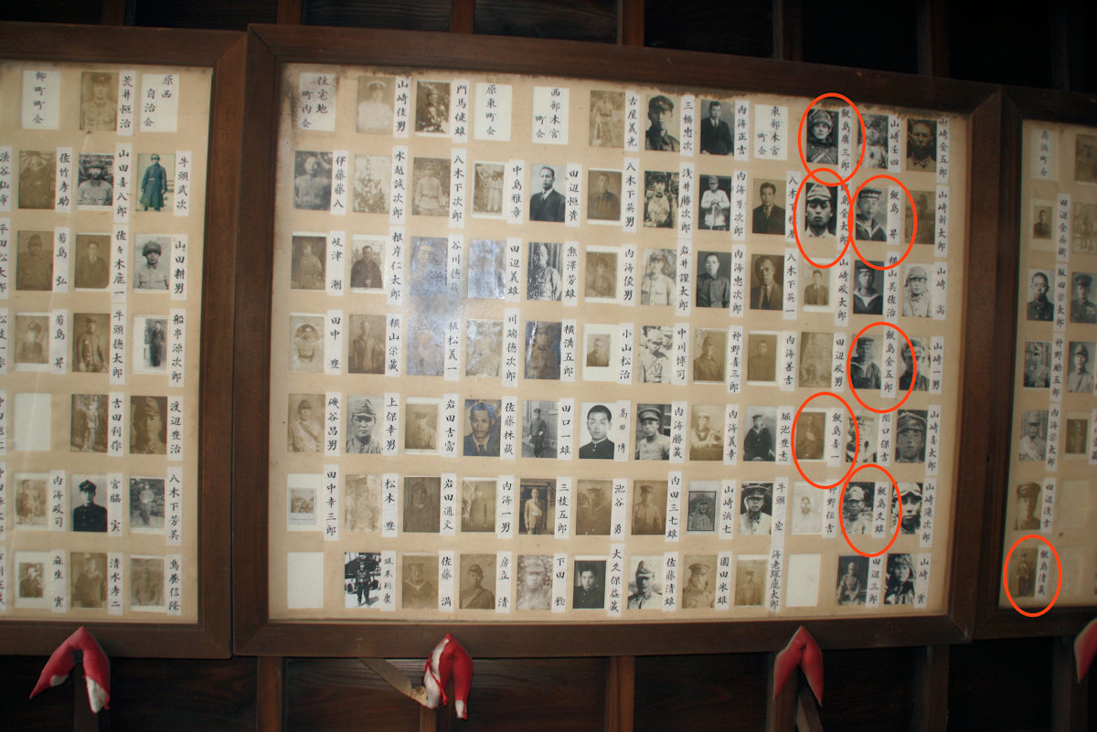 この神社さんには、戦後五十年の記念碑の拝殿の天井に、戦没者の遺影が貼られており、数の多さに圧倒されます。