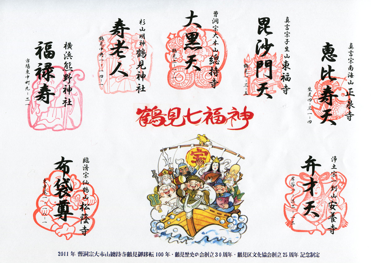 で、何だかんだ文句を言いながら、やじきた道中を進めて確保した「鶴見七福神」の色紙がこれです。あらかじめ印刷された文字の上に、お寺さんや神社さんで用意された印を押すだけ。港北七福神と比べると、何だか味わいが少ない気がします。お土産の七福神の土偶も付いていないし。