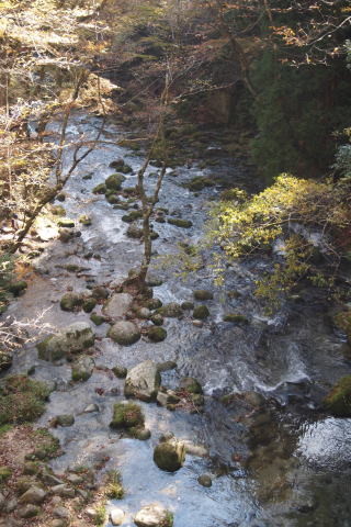 バスを降りて、花貫渓谷を歩きます。途中の山肌に石群が建っています。何か怖いものじゃないだろうな。しばらく歩くと不動の滝です。滝?滝かなあ?