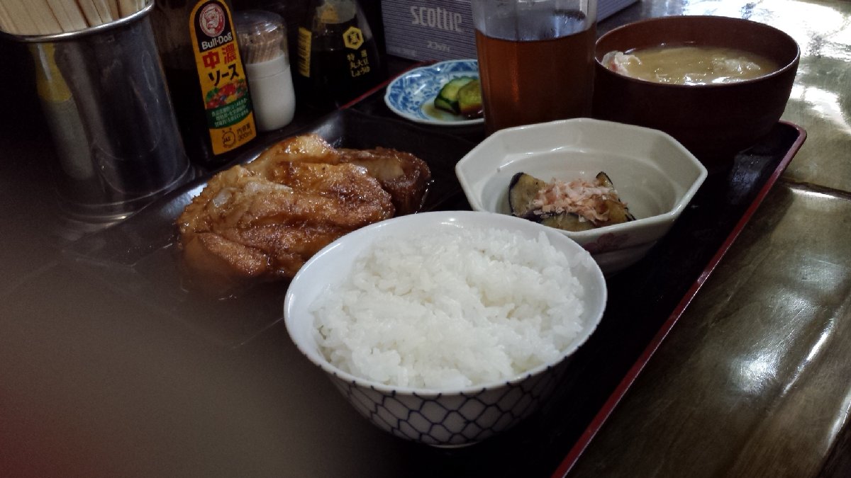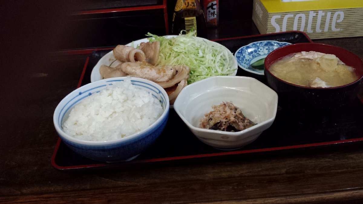 caccoはブタ肩ロース生姜焼き定食を頼んだよ。流石に、すでに一食しているので、箸の出が遅い。