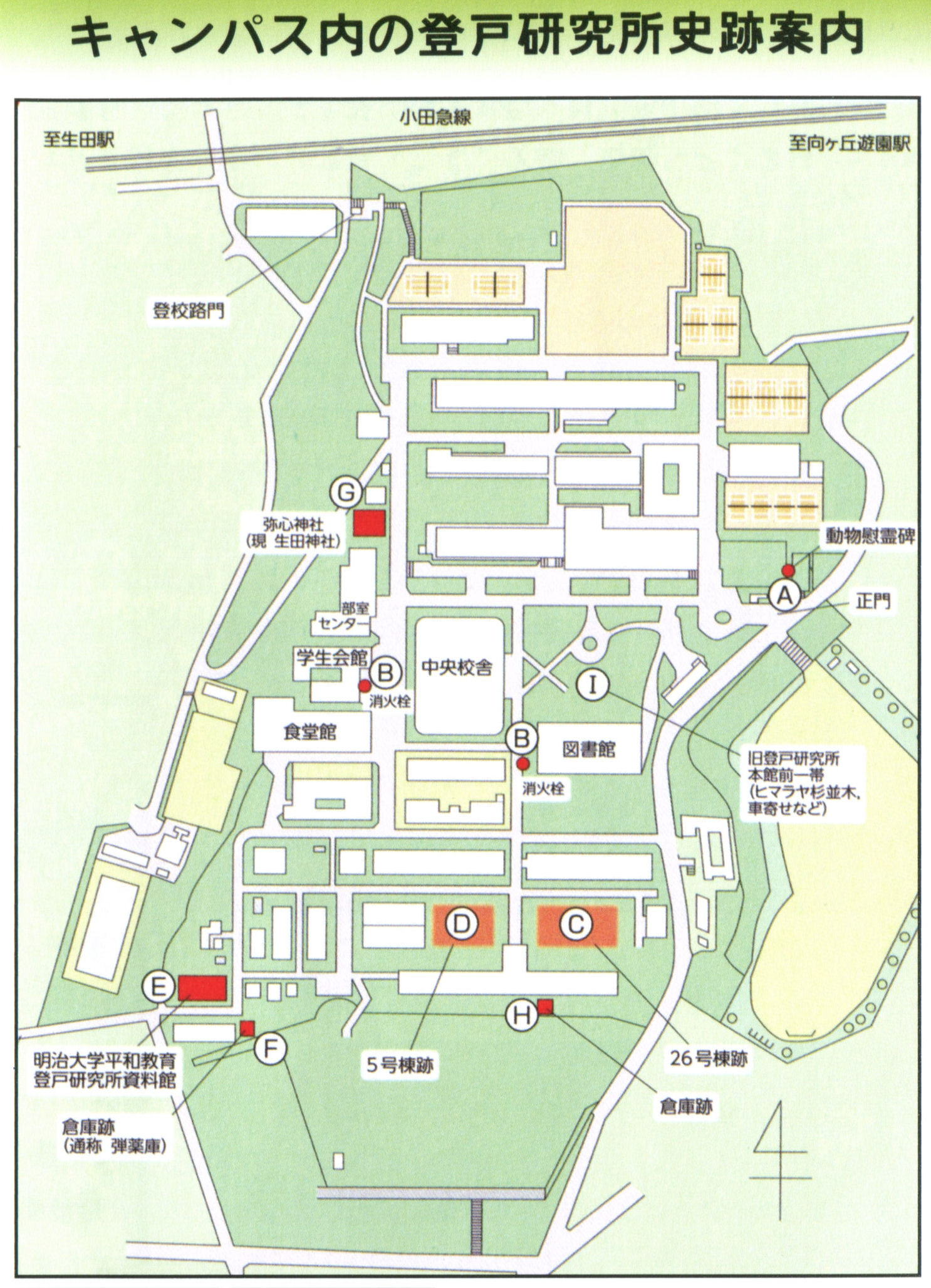 さて、1937(昭和12)年11月に「陸軍科学研究所登戸実験場」として開設されますが、1942(昭和17)年10月には、「第九陸軍技術研究所」となりました。電波兵器・無線機器・宣伝機器などを開発する、技術者が集められました。敷地11万坪,建物100棟余,技術将校などの所員250名,一般の雇員・工員750名ほどの大所帯でした。その後、1950(昭和)年に登戸研究所の敷地の半分を、明治大学が建物ごと取得して、生田キャンパスとしました。