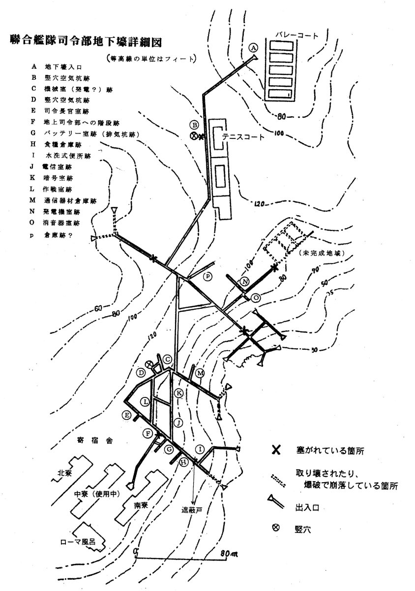 さて、資料によりますと、海軍施設本部第一部長を最高指揮官として東京地方施設事務所が作業隊を編成、資材調達は芝浦補給部によって行われ、大規模で機密度の高い超特急工事であったそうで、機密保持の為に東京憲兵隊があたったとあります。地下壕は延べ2600米に及び、箕輪地区大聖院裏の地下壕を含めると5000米に達し、終戦直後、米軍はこの竪穴坑を見て「茸型の出入り口を持った迷路の地下大要塞と表現したそうです。