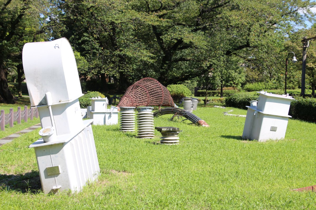 旧日立航空機立川工場変電所跡 変電設備器具をオブジェにしてあります (2015年9月20日)