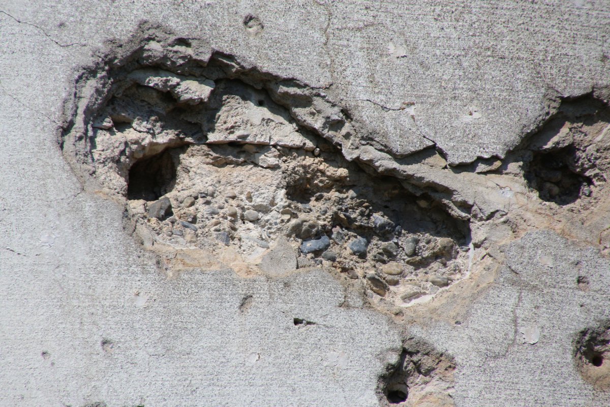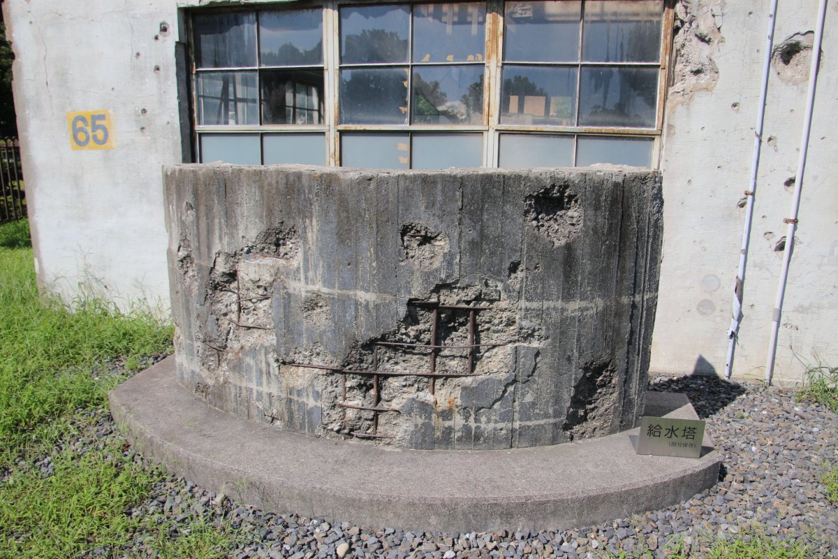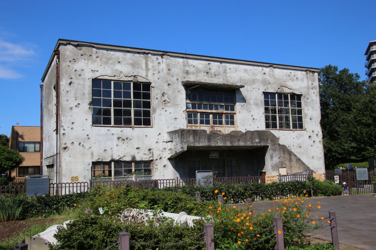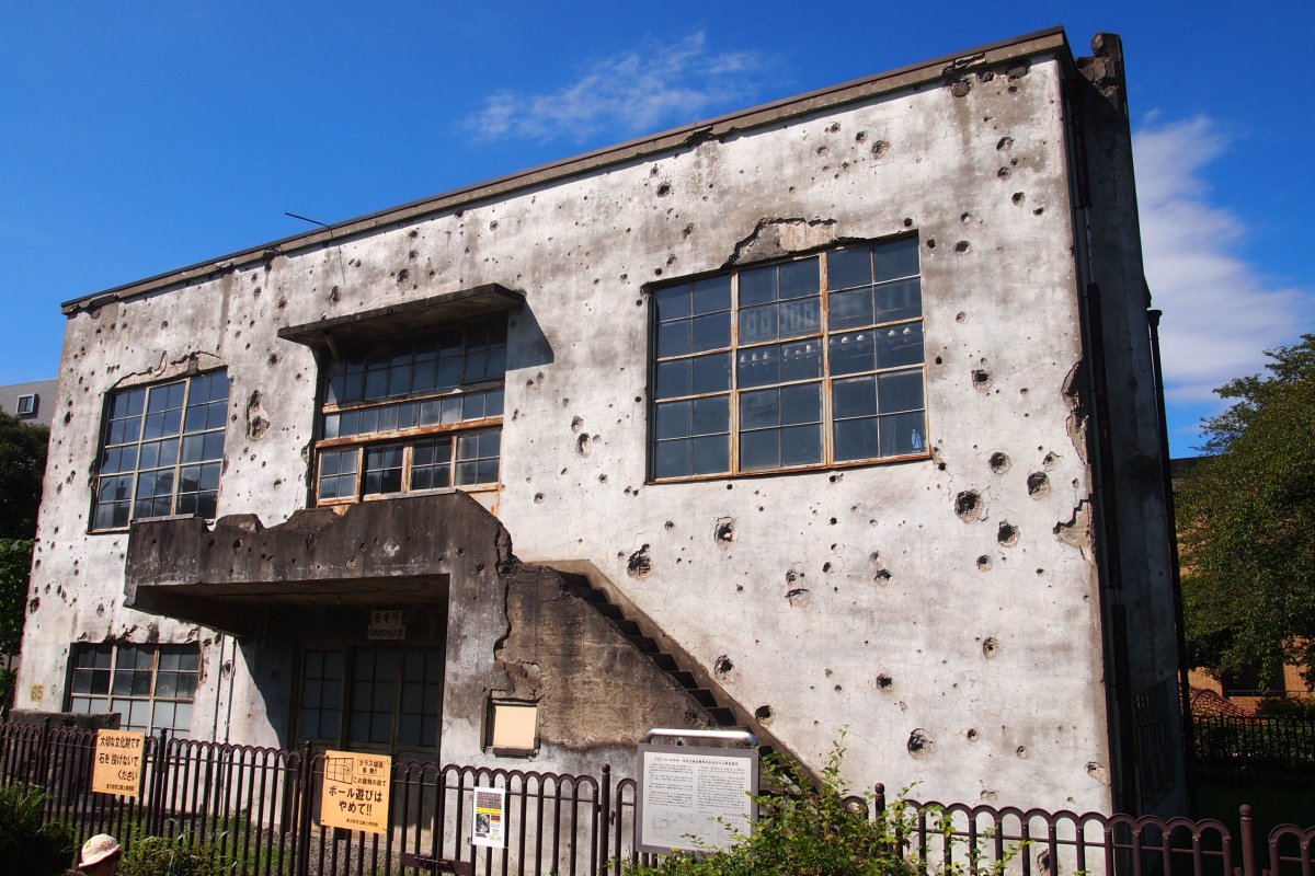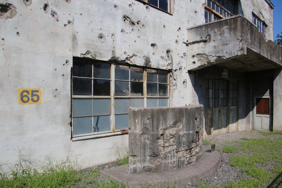 外壁に残る無数の穴は、太平洋戦争の時、アメリカの小型戦闘機による機銃掃射やB-29爆撃機の爆弾が炸裂してできたものです。