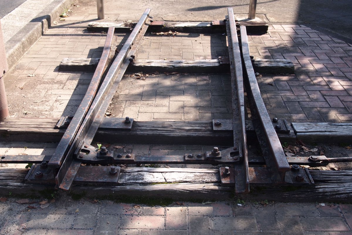 中神陸軍航空工廠線と給水塔 分岐器の遺構 (2015年9月20日)