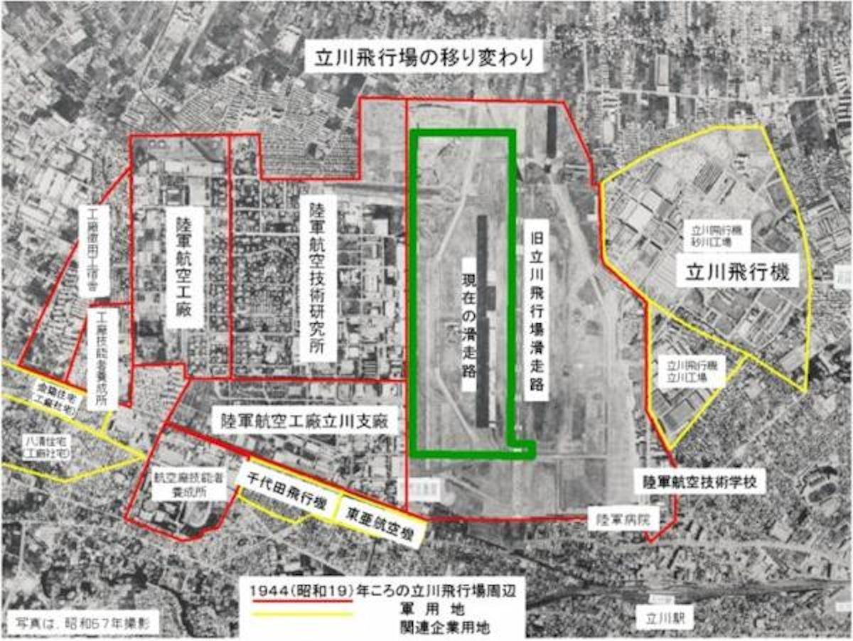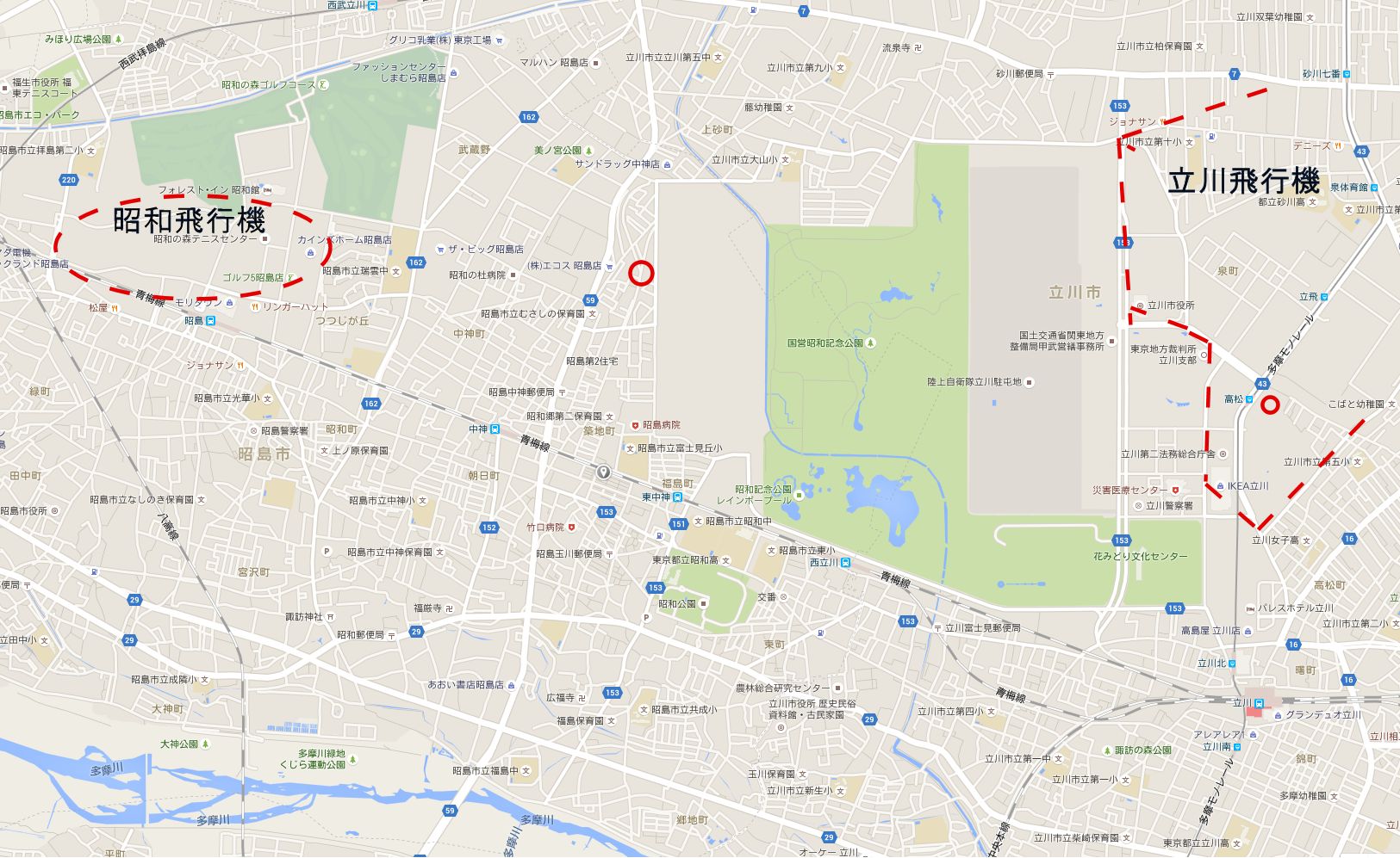 昭和記念公園は、陸軍航空工廠、陸軍航空技術研究所、立川陸軍航空廠がありました。今の自衛隊の駐屯地は、立川飛行場だったところで、立川飛行機の整備工場がありました。立川飛行機の所は立飛企業になりましたが、地図で見ると立川拘置所や多摩モノレールの車両基地になって居ます。
