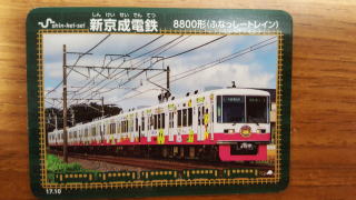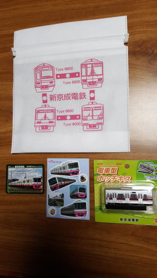 新京成電鉄は、ふなっしー電車かと思いましたら、普通の電車でした。でも、電車型ホチキスを買うと、もれなくふなっしートレインのカードが貰えたよ。