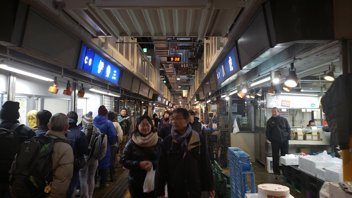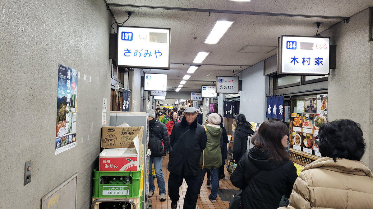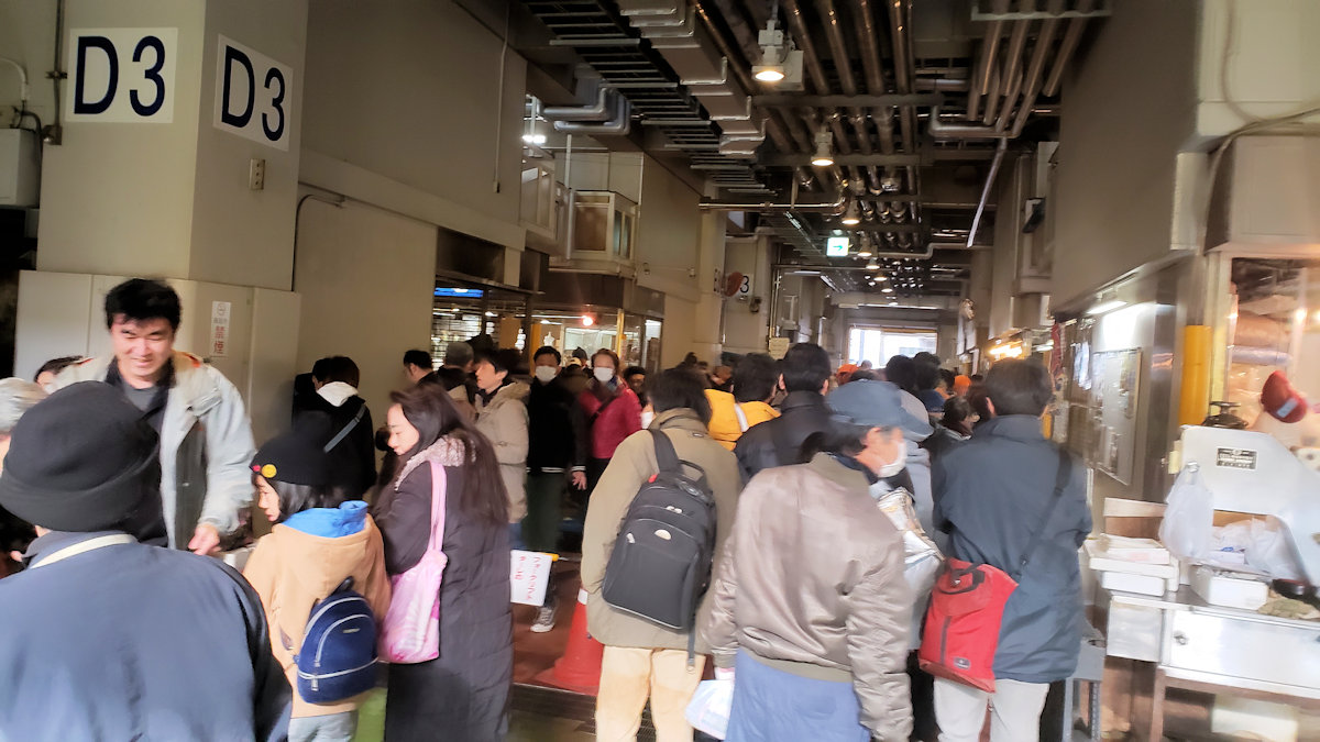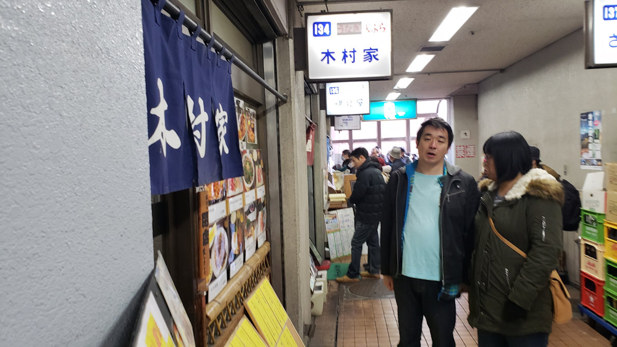 海鮮汁の無料配布やマグロの解体ショーも目もくれず、ひたすら市場の食堂街に向かいます。何しろ、この時間帯はお客さんの大部分が、生鮮食品を買おうとお店に列をなしているので、食堂街の方はガラガラです。
