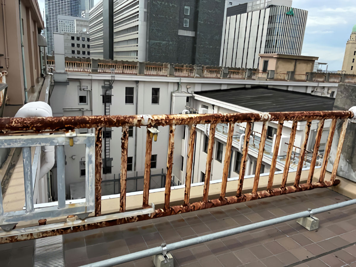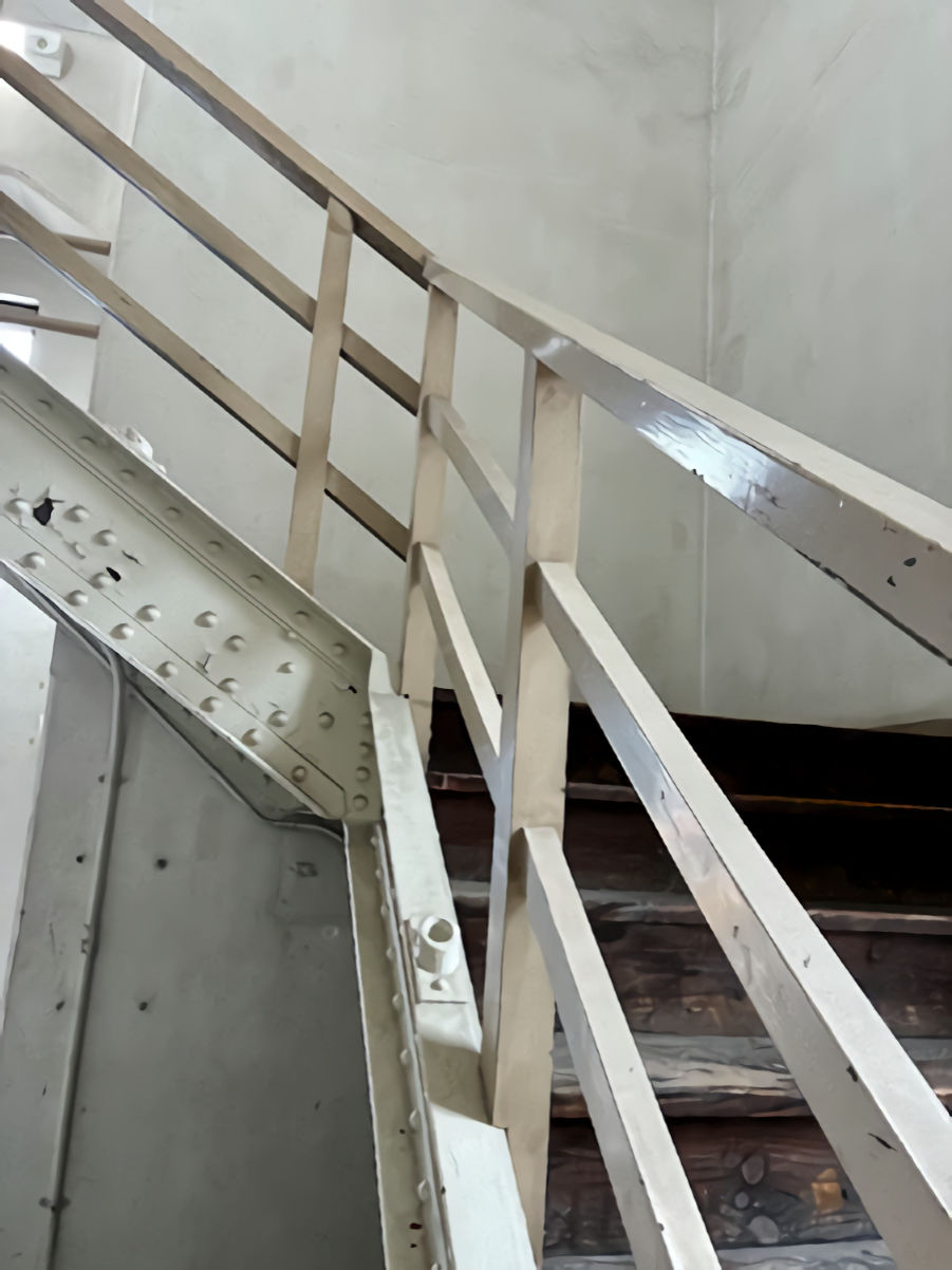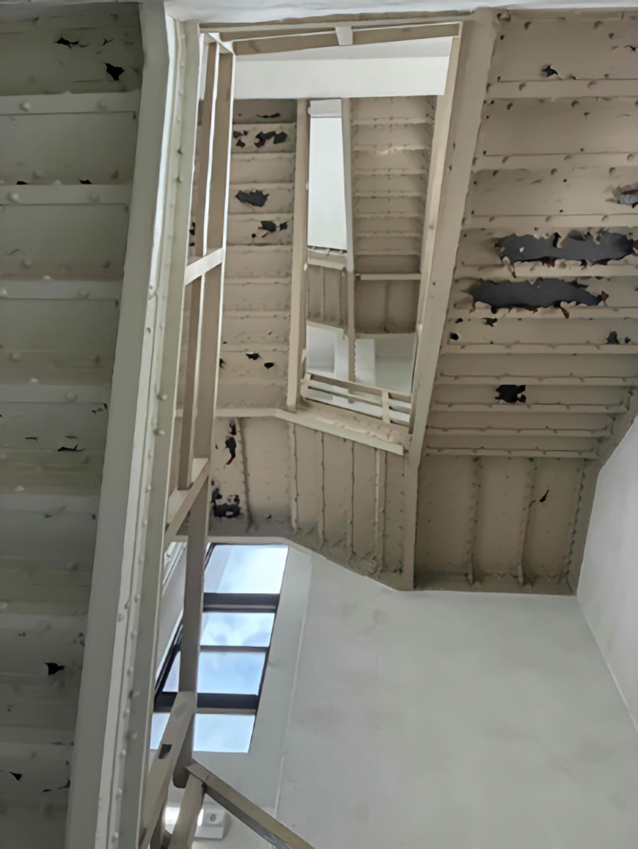 屋上に向かう階段の踏み板も、階段の裏側もぼろぼろで立ち入り禁止