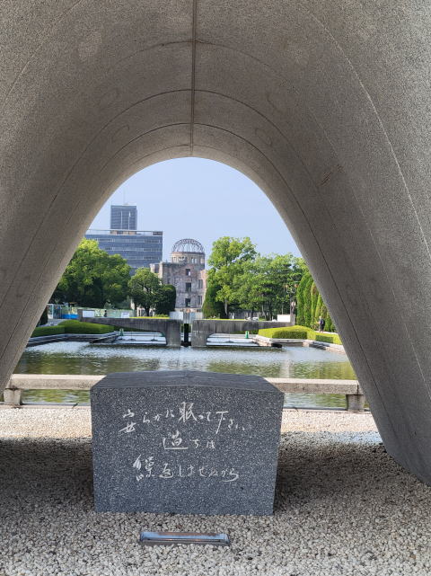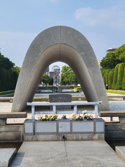 アーチの下に置かれているのが、原爆死没者慰霊碑です。